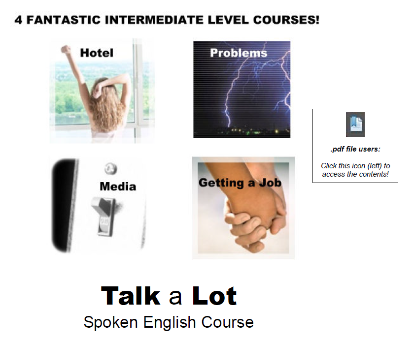 This Talk a Lot course book for Intermediate to Advanced levels features four interesting in-depth units on the following topics: Hotel, Problems, Media, and Getting a Job